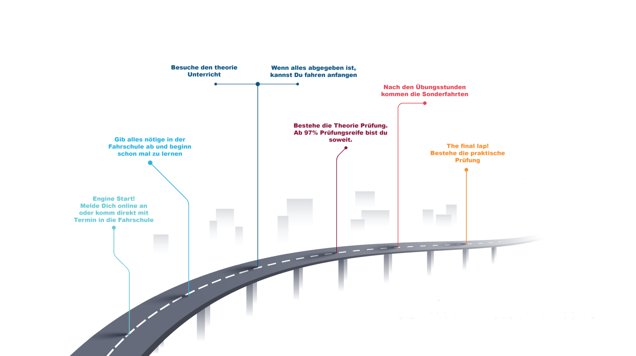 6. Die Praxis (Ab auf die Straße) Jetzt geht’s ins echte Auto! Du machst Übungsstunden in der Stadt und die gesetzlichen Sonderfahrten (Überland, Autobahn und Nachtfahrten). Dein Fahrlehrer zeigt dir alle Tricks, damit du sicher fährst.